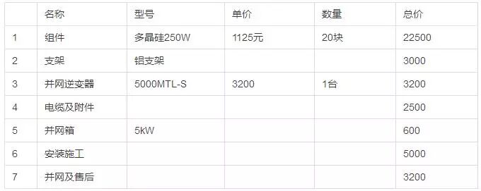 光伏能不能装,说了不算,关键要看投资收益比,小陈的房间面积不大,可以装20块组件,先让我们算一下2013年安装光伏电站的投资和收益。 2013年主流组件是多晶250W,价格约4.5元每瓦,20块组件容量为5kW。总费用约4万元。