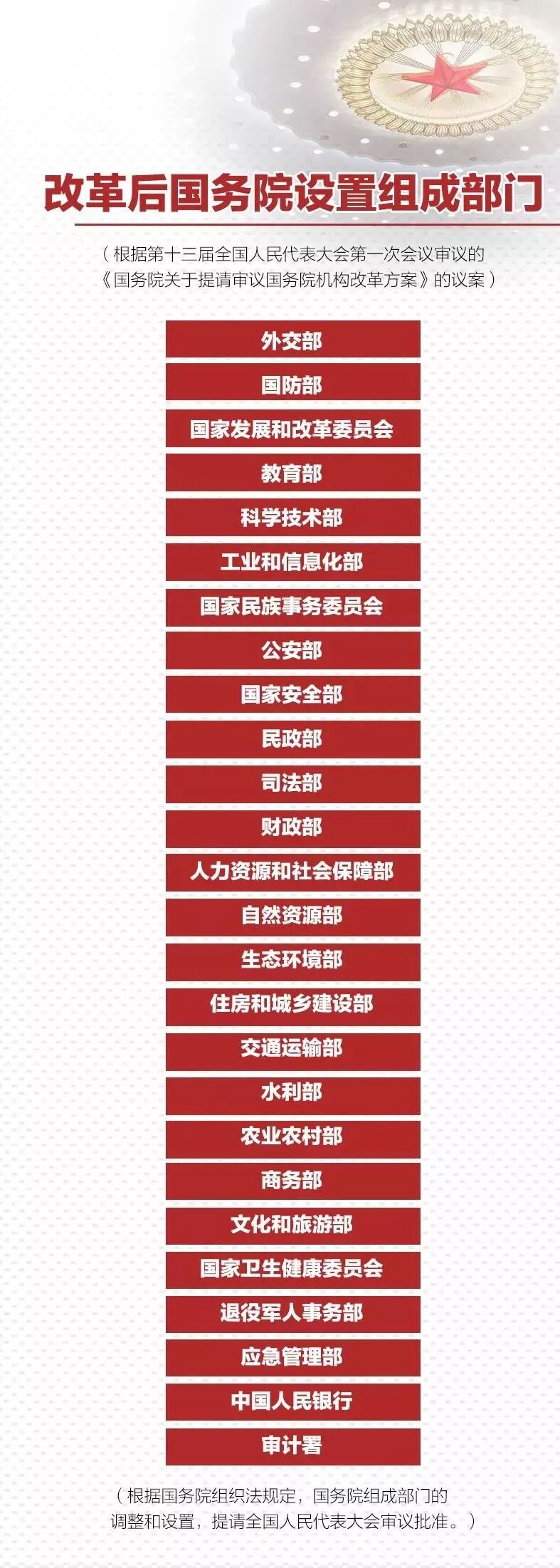 今天,国务院机构改革方案提请十三届全国人大一次会议审议。根据该方案,改革后,国务院正部级机构减少8个,副部级机构减少7个,除国务院办公厅外,国务院设置组成部门26个。