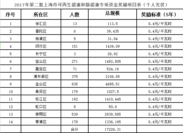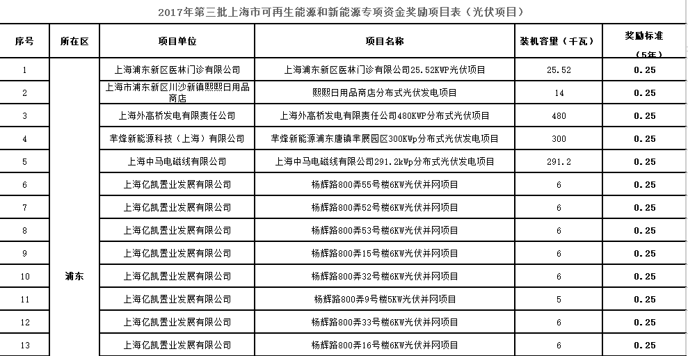 | 利好 | 分布式0.25元/度,个人项目0.4元/度,连补五年!上海市发改委公布2017年第三批可再生能源发展专项金奖励目录! |