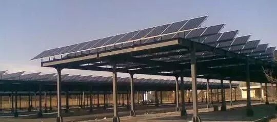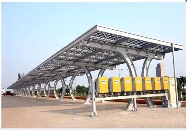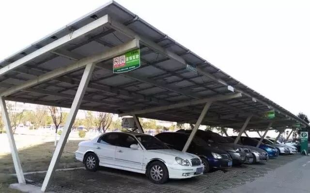 光伏车棚是将光伏发电与车棚相结合的系统。既能为车辆遮风挡雨,又能利用太阳能创造出清洁光伏能源供电动车充电、灯光照明和并入电网。此系统建造几乎没有地域限制,非常灵活方便,综合利用空间资源发展新能源。