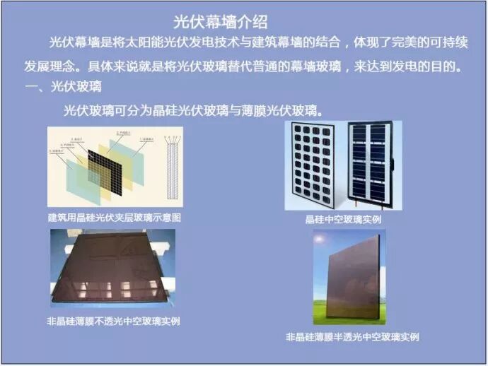 光伏幕墙是将太阳能光伏发电技术与建筑幕墙的结合, 体现了完美的可持续发展理念。具体来说就是将光伏发电玻璃替代为普通的幕墙玻璃,来达到光伏发电想目的。