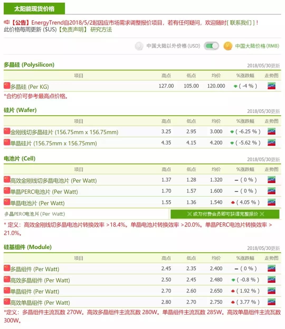 目前整体市场的单晶用硅料的期待价格已经来到RMB 120/Kg上下,多晶用硅料的期待价格也已跌至RMB 105/Kg上下。其中,下游市场对多晶产品的需求不振已影响到多晶用硅料的供需平衡;相较之下,单晶用硅料受惠于 630 装机潮所带动的需求而暂无降价问题。然而,若多晶用硅料仍跌跌不休,估计七月就会影响到单晶用硅料的价格水平。