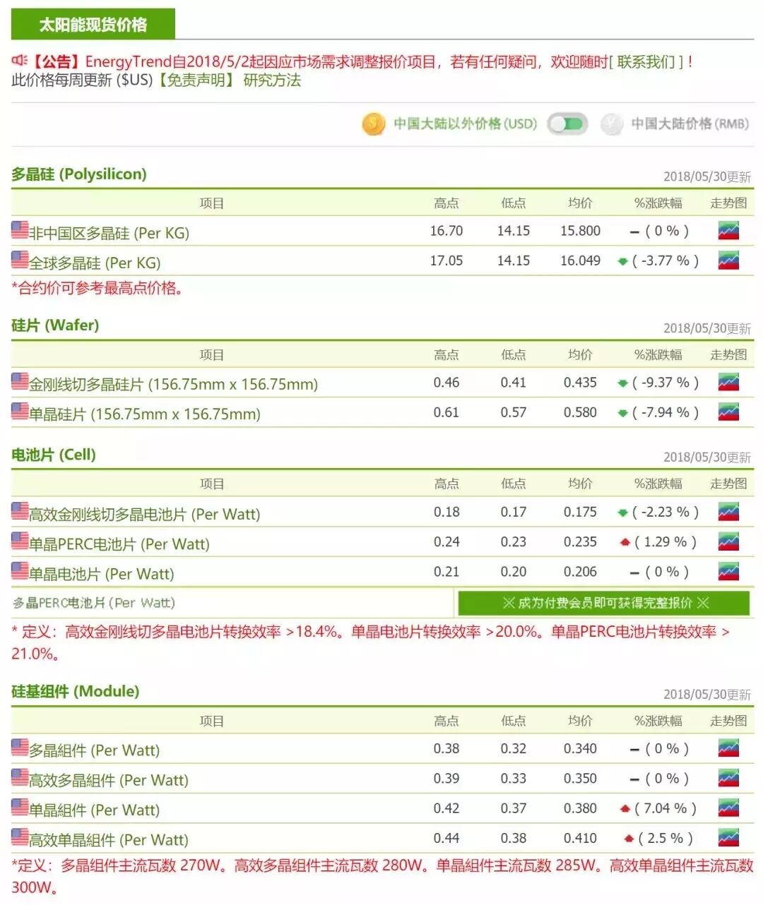 单晶组件价格随近期较为火热的市况较为坚挺,多晶组件则是在本月不时听到出清库存的破盘价,但随着630需求缓步拉动,各厂家的组件库存已逐渐消纳。 在多晶硅片、电池片端,单多晶价差仍持续拉大,近期多晶产品较好的性价比也可望刺激三季度末的多晶需求。后续单、多晶产品价格、市占率的拉锯仍将持续。  |