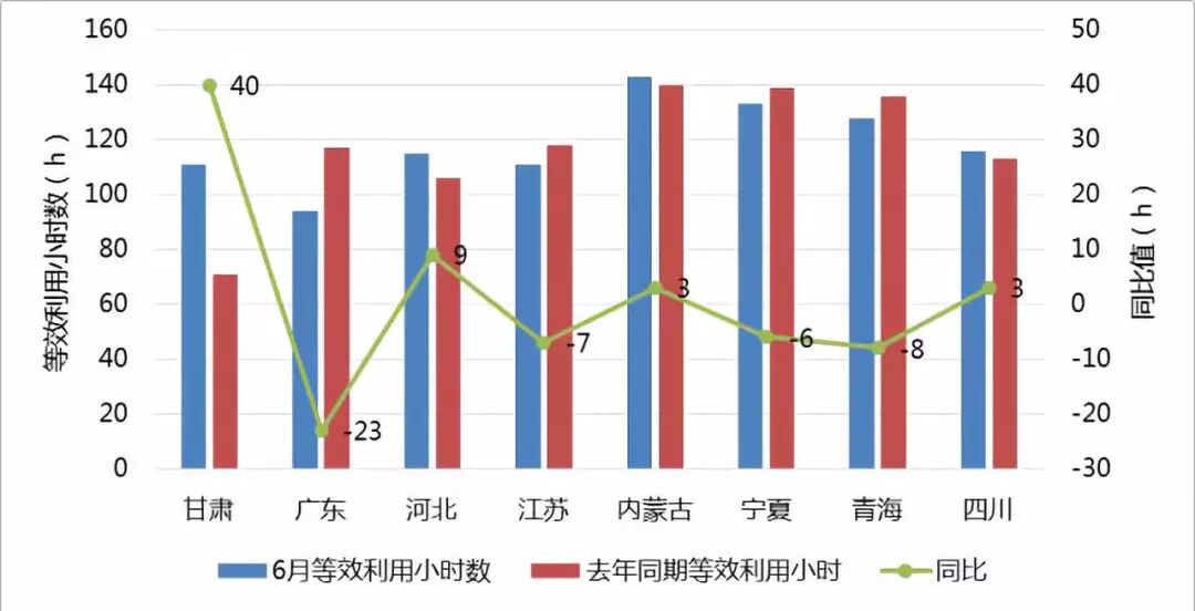 由以上图表可以看出,2018年6月,除甘肃、河北、内蒙和四川外,其他省份的利用小时数均较去年同期低。甘肃省的平均等效利用小时数较去年同期同比增加最多,高达40小时!广东、江苏、宁夏和青海的平均等效利用小时数与去年同期相比,分别减少23小时、7小时、6小时和8小时。