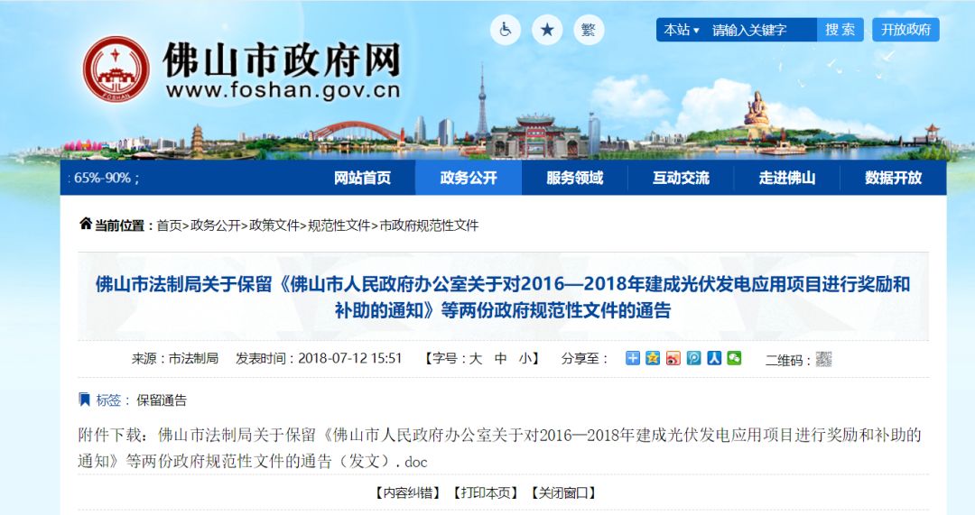 7月12日,佛山市政府网发布了佛山市法制局关于保留《佛山市人民政府办公室关于对2016—2018年建成光伏发电应用项目进行奖励和补助的通知》等两份政府规范性文件的通告。