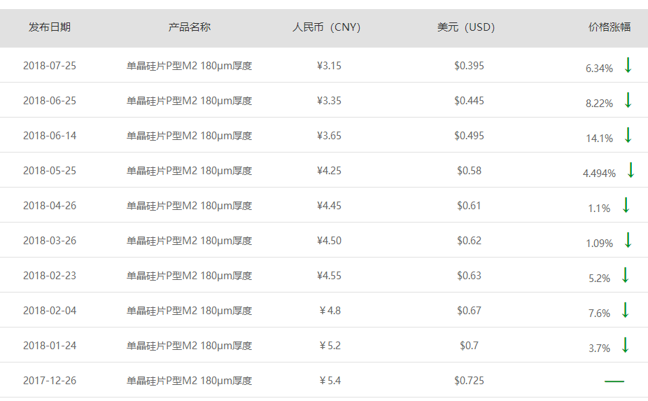 180μm厚度P型M2单晶硅片价格由国内每片3.35元人民币、海外0.445元美金降至国内每片3.15元人民币、海外0.395元美金 ,每片下降0.2元人民币、0.05元美金,价格跌幅为5.97%。
