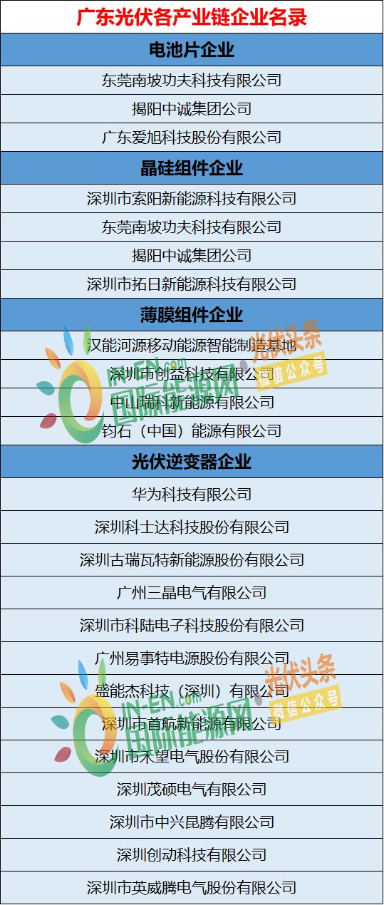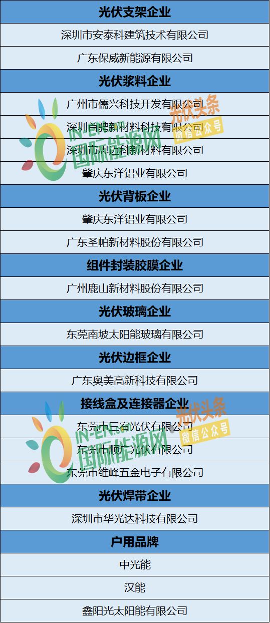 光伏逆变器企业:华为科技有限公司、深圳科士达科技股份有限公司、深圳古瑞瓦特新能源股份有限公司、广州三晶电气有限公司、深圳市科陆电子科技股份有限公司、深圳市英威腾电气股份有限公司; 电池片企业:广东爱旭科技股份有限公司; 晶硅组件企业:深圳市拓日新能源科技有限公司、深圳市索阳新能源科技有限公司; 光伏支架企业:广东保威新能源有限公司; 光伏背板企业:肇庆东洋铝业有限公司、广东圣帕新材料股份有限公司; 光伏玻璃企业:东莞南坡太阳能玻璃有限公司;