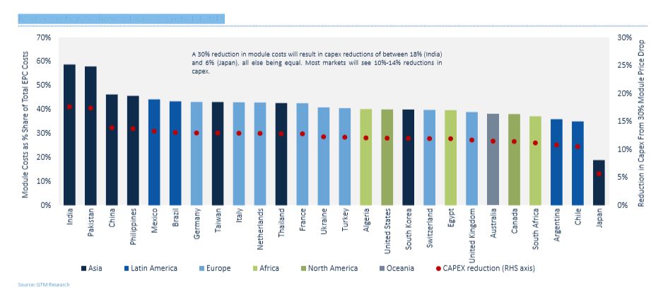 组件价格下降的好处主要体现在亚洲市场,在其他条件相同的情况下,组件成本降低30%将导致大多数市场的资本支出减少10%-14%。而印度资本支出将减少18%,日本资本支出减少6%,为亚洲最低。
