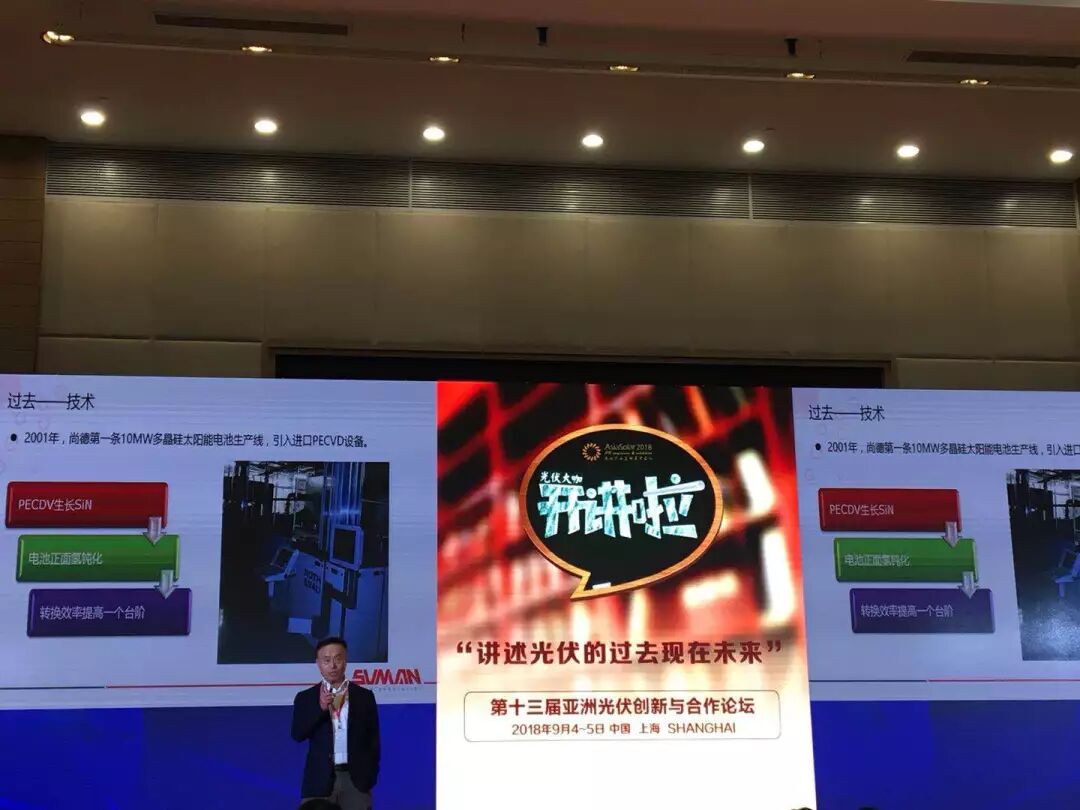 2 第二,从外到内的转折。一开始的技术、人才、市场、资本都是海外的,然后转成国内,光伏产业必将成为能源转型的中坚力量,我们要有信心,从这个角度不要考虑改行,而是考虑如何把这个产品像电视机、空调一样推向千家万户。 技术:我2001年回国,当时我也很矛盾,选什么样的技术?我在国外是做多晶硅薄膜的,很可能做薄膜了。我说做单晶硅、多晶硅还是薄膜呢?是做组件、电池还是什么呢? 后来我想,还是做电池,当年国内的电池转化效率,单晶在10%,多晶在12%左右,我想主要做多晶。国外的实验室当年的研究,一直延续到现在都没有离开技术的核心,所以我就选择这样一条路线,做多晶硅,选择了很多设备,结果很快我们做到15%的转化效率。