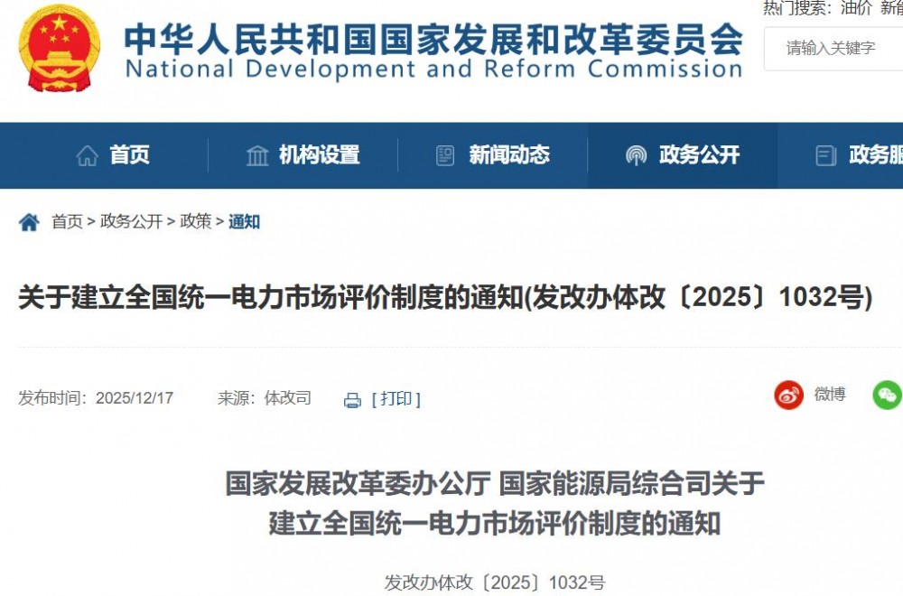 12月17日,国家发展改革委办公厅 国家能源局综合司关于建立全国统一电力市场评价制度的通知。